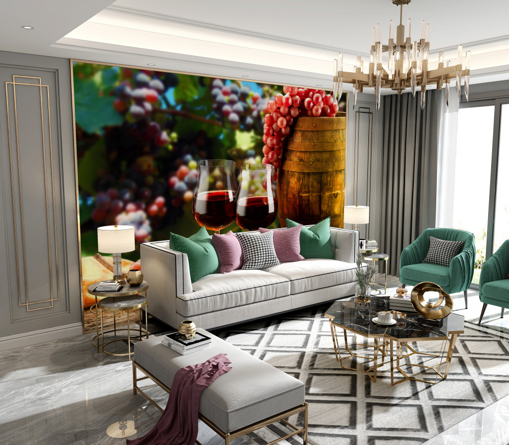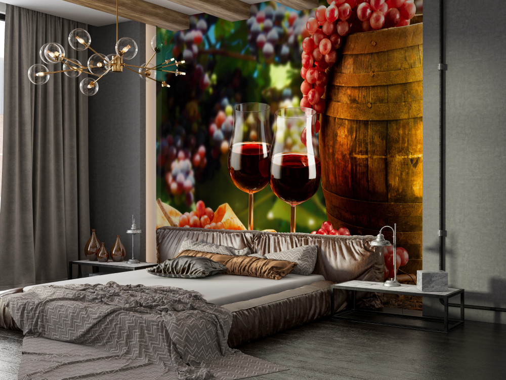 Tapeta Fototapeta kieliszki do wina na tle winogron (artykuł a92394 ) z kategorii Fototapety Zrób jadalnię