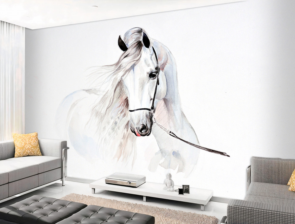 Tapeta Fototapeta biały koń w uprzęży (artykuł a93326 ) z kategorii Fototapety Zwierzęta