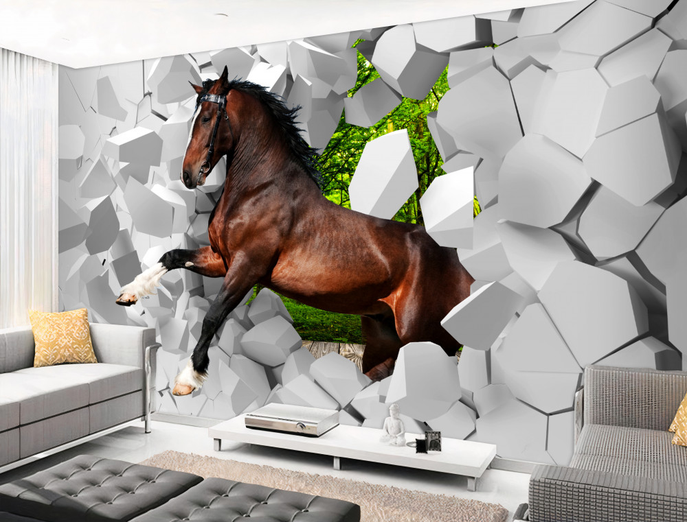 Tapeta Fototapeta brązowy koń rozbija ścianę (artykuł a91609 ) z kategorii Fototapety Zwierzęta