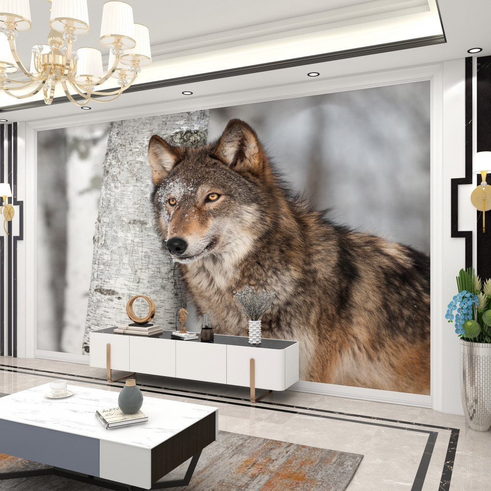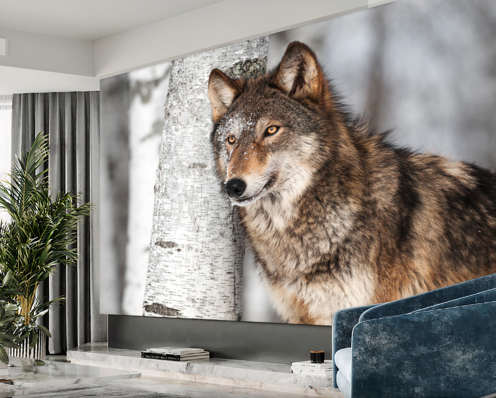 Tapeta Fototapeta brązowy wilk czai się w pobliżu brzozy (artykuł a89384 ) z kategorii Fototapety Zwierzęta