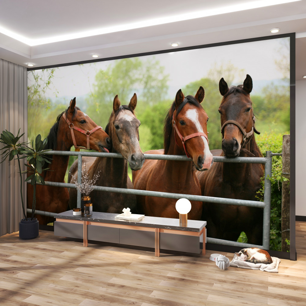 Tapeta Fototapeta cztery brązowe konie w zagrodzie (artykuł a89369 ) z kategorii Fototapety Zwierzęta