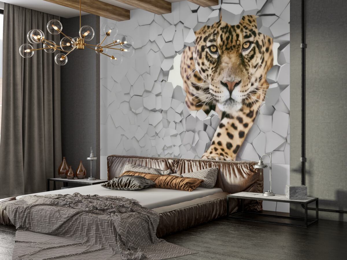 Tapeta Fototapeta Lampart wypełza z białej ściany (artykuł a97803 ) z kategorii Fototapety Zwierzęta