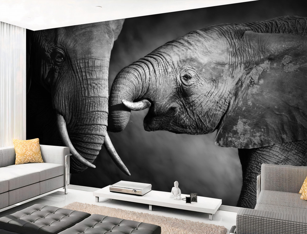 Tapeta Fototapeta matka i mały czarno-biały słoń (artykuł a89379 ) z kategorii Fototapety Zwierzęta