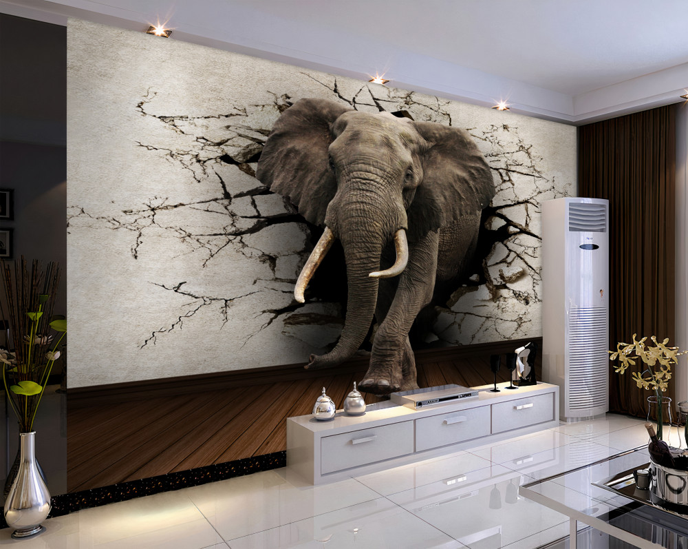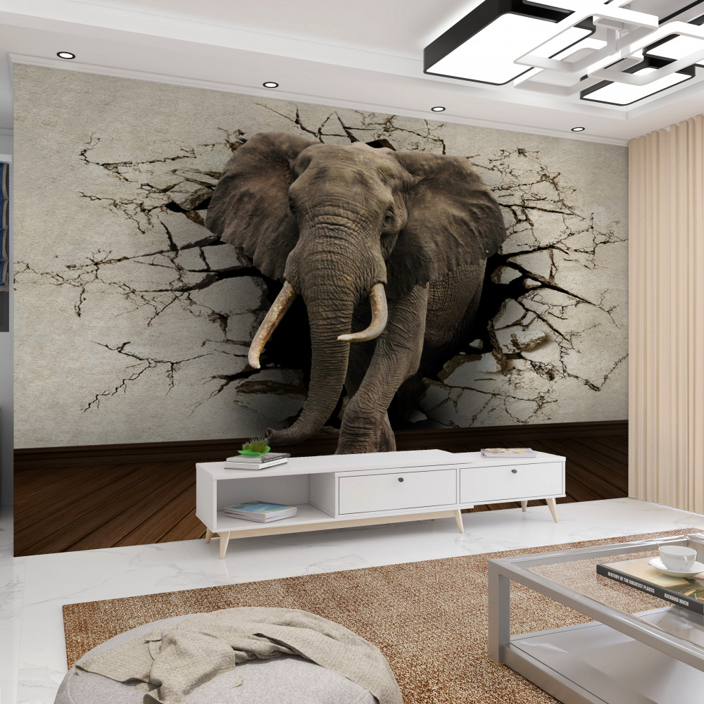 Tapeta Fototapeta potężny słoń przebija się przez szarą ścianę (artykuł a90975 ) z kategorii Fototapety Zwierzęta