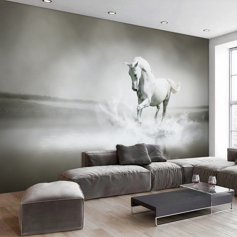 Tapeta Fototapeta potężny tupot białego konia po wodzie (artykuł a92349 ) z kategorii Fototapety Zwierzęta