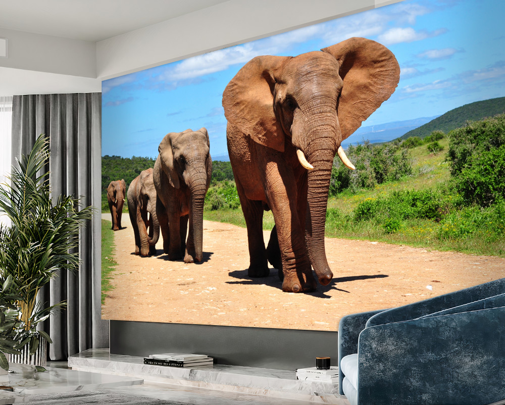 Tapeta Fototapeta rodzina słoni wraca do domu wzdłuż piasku (artykuł a89390 ) z kategorii Fototapety Zwierzęta