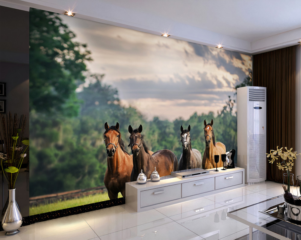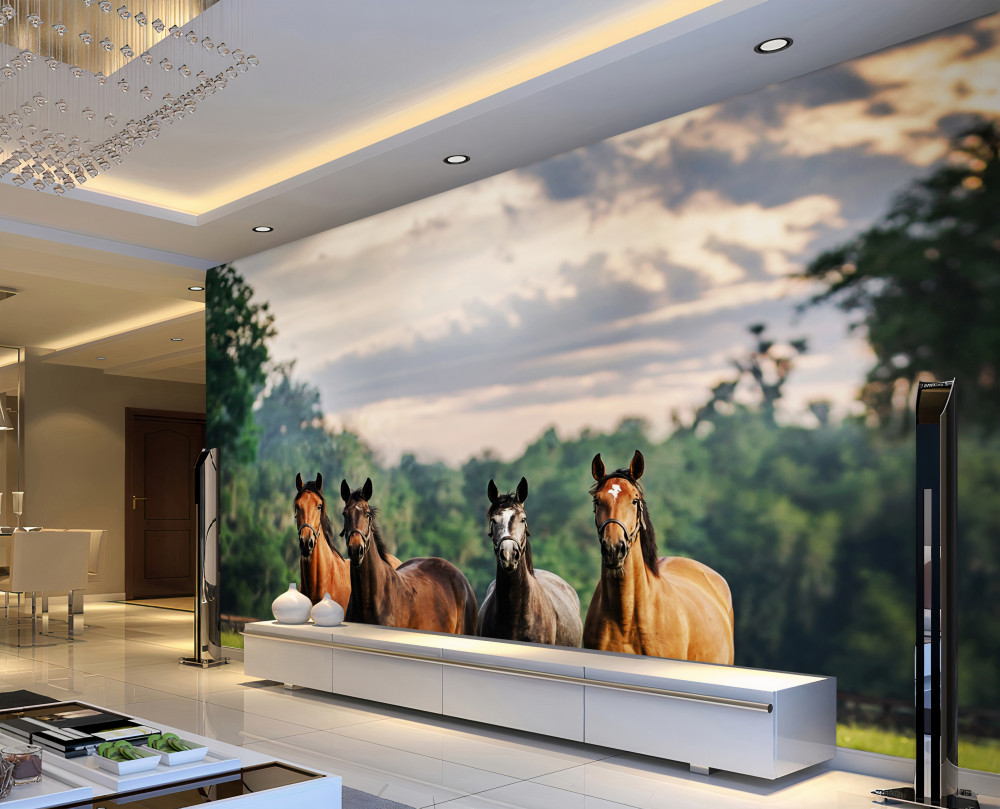 Tapeta Fototapeta stado czterech koni odpoczywających na łące (artykuł a89392 ) z kategorii Fototapety Zwierzęta