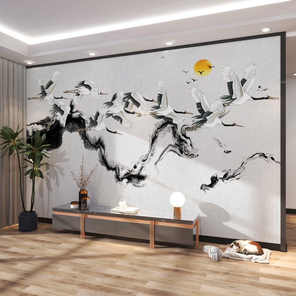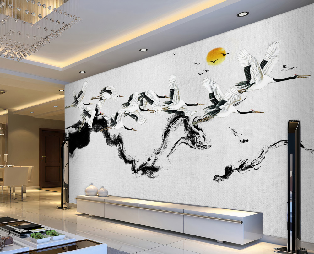 Tapeta Fototapeta stado żurawi czerwonokoronowanych leci w stronę zachodzącego słońca (artykuł a91993 ) z kategorii Fototapety Zwierzęta